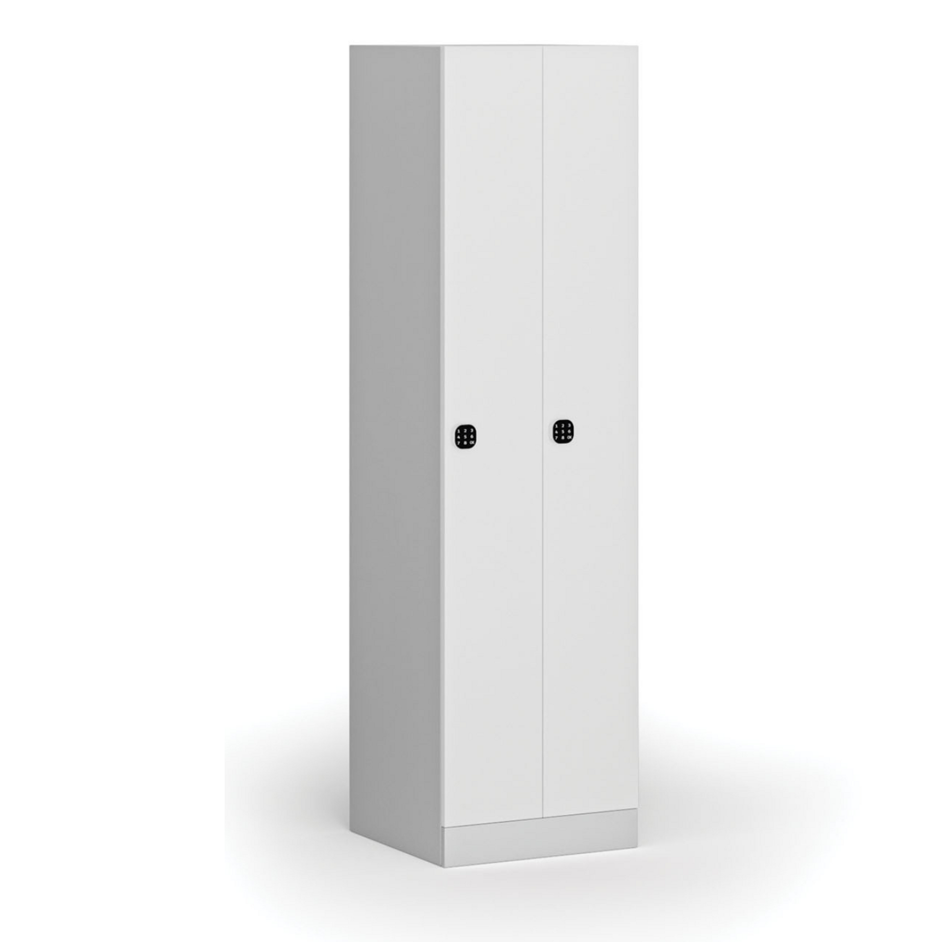 Dvere sú osadené elektronickým kódovým zámkom s dotykovou číselnou klávesnicou. Skrinku ľahko a rýchlo odomknete zadaním PIN kódu (bez použitia kľúča). Zámok sa napája batériou CR2032 (nie je súčasťou balenia) a ponúka jednoduché ovládanie, dlhú výdrž aj indikáciu slabej batérie. Nastaviť je možné užívateľský aj manažérsky kód. Elegantné prevedenie v čierno-striebornej farbe.