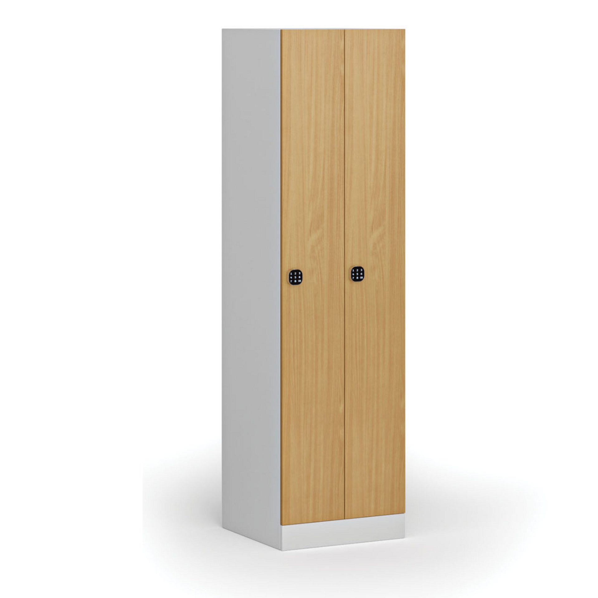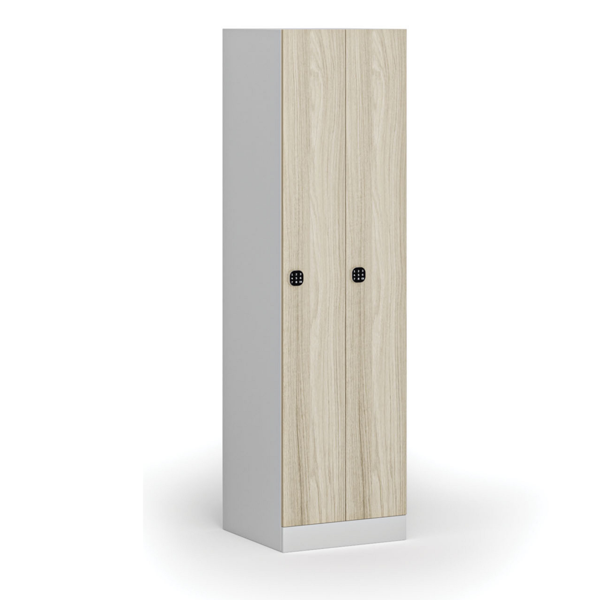 Kovová šatníková skrinka s laminovanými dverami predstavuje elegantný kompromis - spája maximálnu odolnosť oceľovej konštrukcie (0,6 mm) s reprezentatívnosťou dreva.