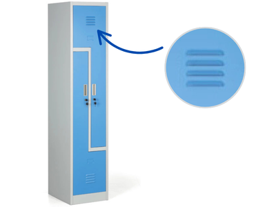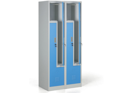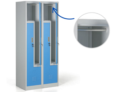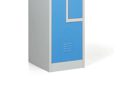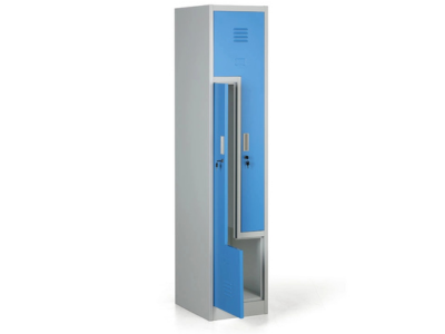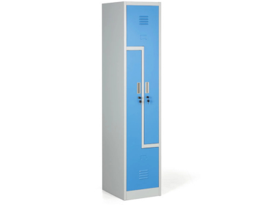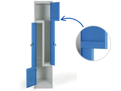 Skrinka typu Z šikovne rozdeľuje priestor jedného oddielu (šírka 200 mm) na hornú a dolnú časť, pričom každá slúži ako samostatne uzamykateľný úložný priestor. Skrinka so Z dverami je ideálna pre 2 osoby alebo ako alternatíva k širokým skrinkám s medzistenou, kde je možné oddeliť civilný a pracovný odev. Oproti klasickým skrinkám je však potrebné pri skrinke Z počítať s o niečo nižšou výškou na zavesenie odevov - cca 1275 mm.