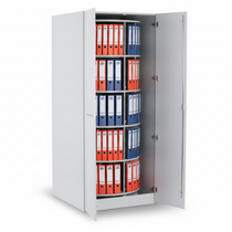 Archivačný systém, ktorý Vám ušetrí priestor pri archivácii Vašich písomností. Vďaka otočnému mechanizmu je možné usporiadať až 144 zakladačov, otočný stĺp si vyžaduje iba asi 1 m2 pre jeho umiestnenie a pre samotný prístup k zakladačom. Pri bežnom použití archivačnej skrine alebo regálov na zakladače potrebujete priestor cca 2 m2. Výhoda úspory miesta pri použití otočných archivačných stĺpov sa zvyšuje úmerne s počtom inštalovaných stĺpov, napríklad pri použití dvoch stĺpov je úspora miesta už 1,5 m2. Otočná skriňa je nasadená na otočný kríž, veľmi ľahké otáčanie zaisťujú ložiská umiestnené priamo v otočnom stojane vybavenom stavacími skrutkami, ktoré slúžia k vyrovnaniu možných nerovností podlahy. Konštrukcia skrine je samonosná, zaisťujúca veľmi dobrú pevnosť a stabilitu. Úrovne skrine sú z laminátovej drevotriesky s plastovou hranou zabraňujúcou samovoľnému vysunutiu zakladače mimo obvod skrine. Úroveň je možné otočiť, čím vznikne doska bez hrán zabraňujúca samovoľnému vysunutiu zakladačov. Kapacita jednej úrovne je 24 zakladačov. Úroveň tvorí kruhová laminátová doska s priemerom 80 cm. Všetky úrovne sa otáčajú naraz. Je možné vytvoriť až šesťúrovňovú archivačnú otočnú skriňu. Štandardné farebné vyhotovenie je v sivej a čiernej farbe. Zakladače na fotografiách nie sú súčasťou dodávky. Skriňa je dodávaná v kartóne s návodom k jednoduchej montáži..