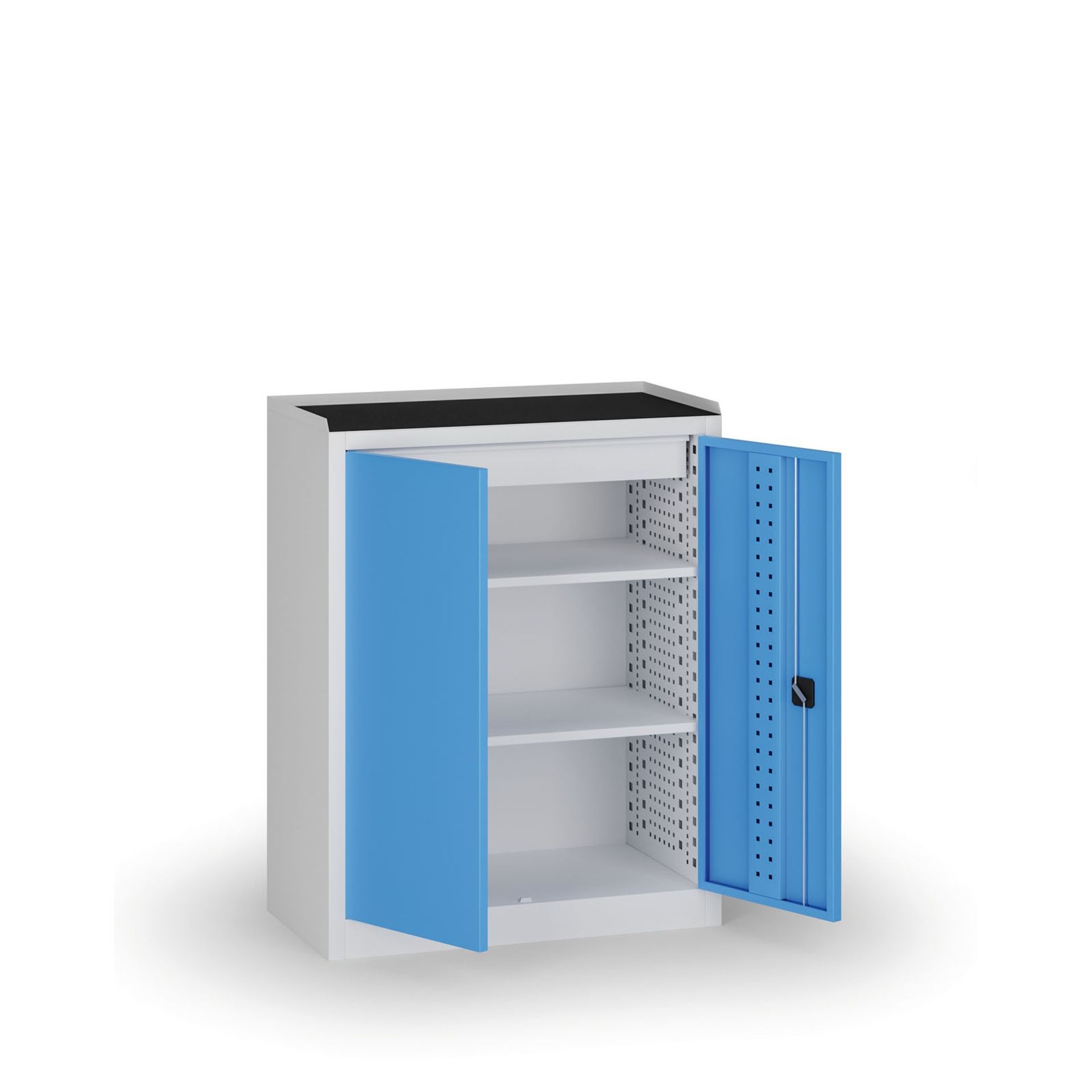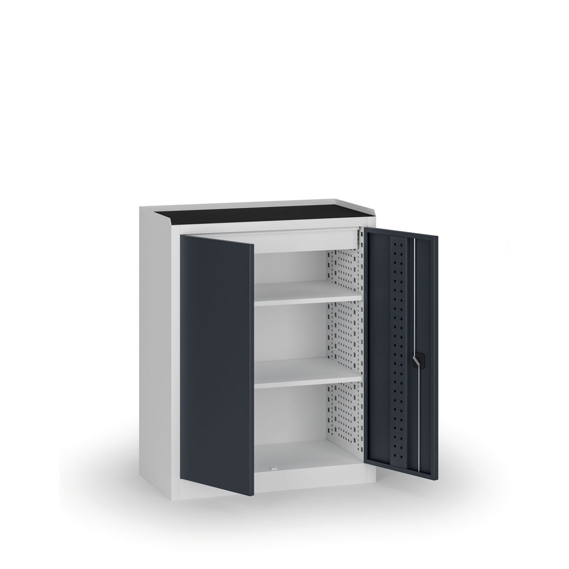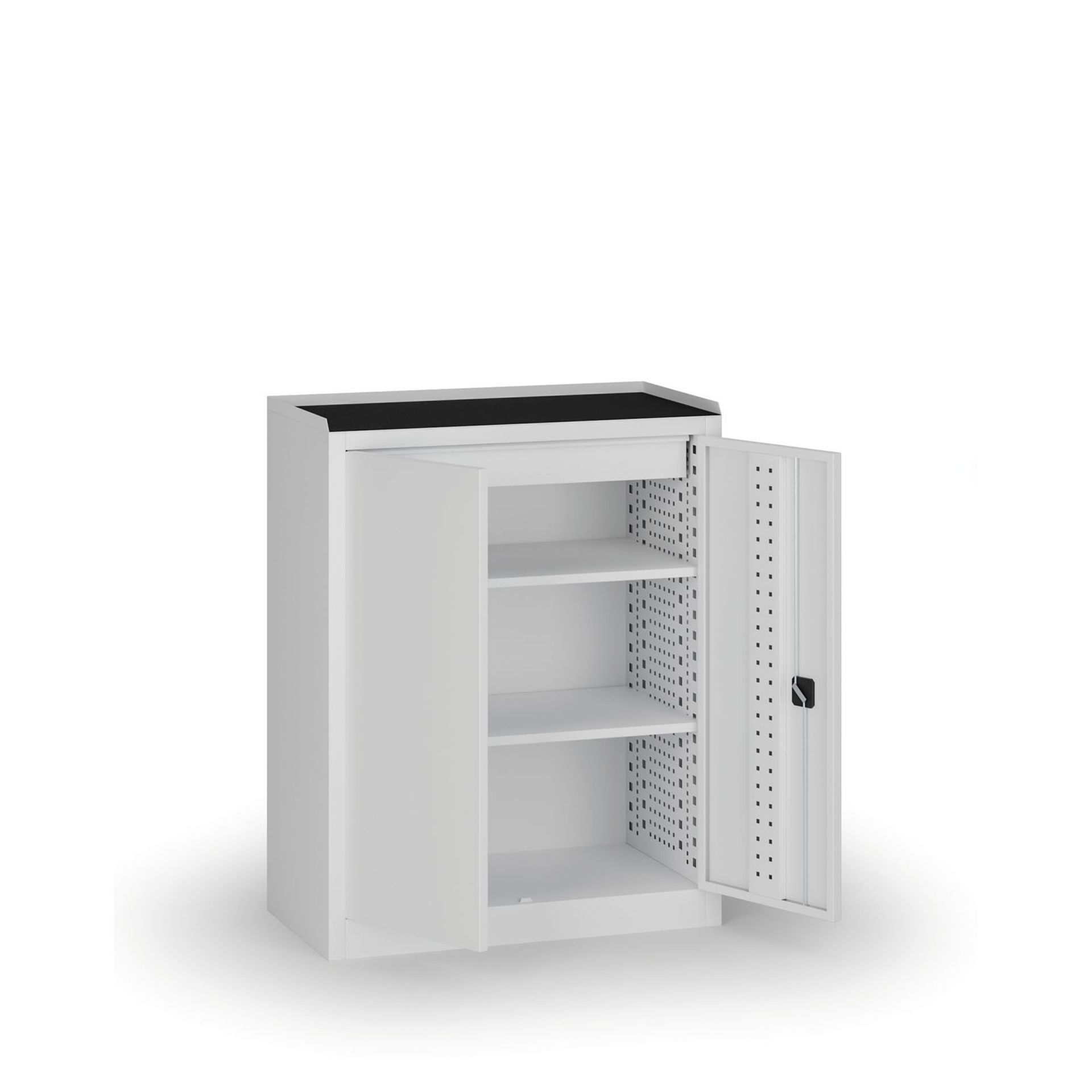 Nízka skriňa s 1 zásuvkou a 2 policami, perforácia vnútornej strany dverí a bokov (EuroPerfo 10 × 10 mm, rozstup 38 × 38 mm), korpus RAL 7035, nosnosť 400 kg.
