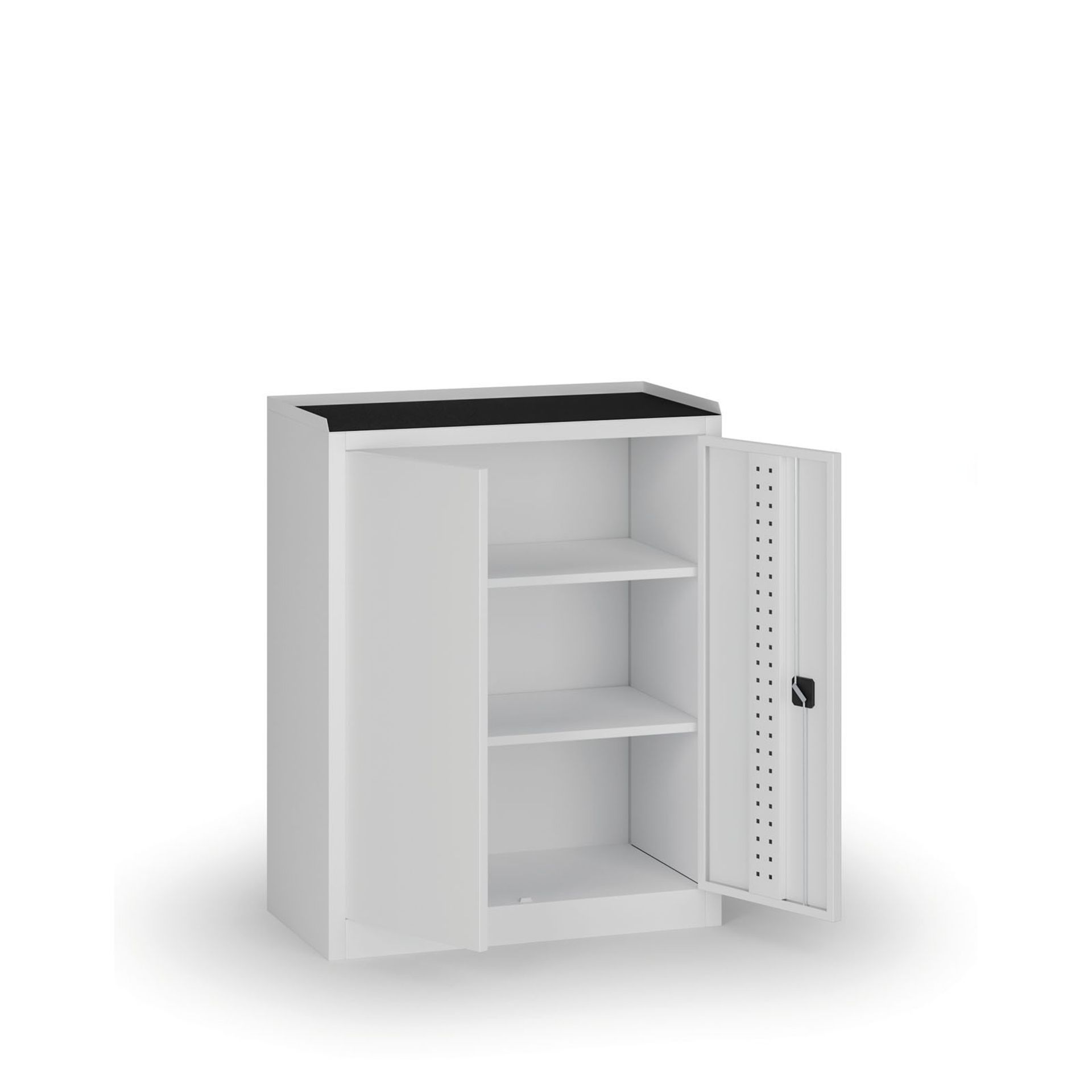 Niska szafa warsztatowa z 2 półkami, perforacja po wewnętrznej stronie drzwi (EuroPerfo 10 × 10 mm, rozstaw 38 × 38 mm), korpus RAL 7035, nośność 400 kg.