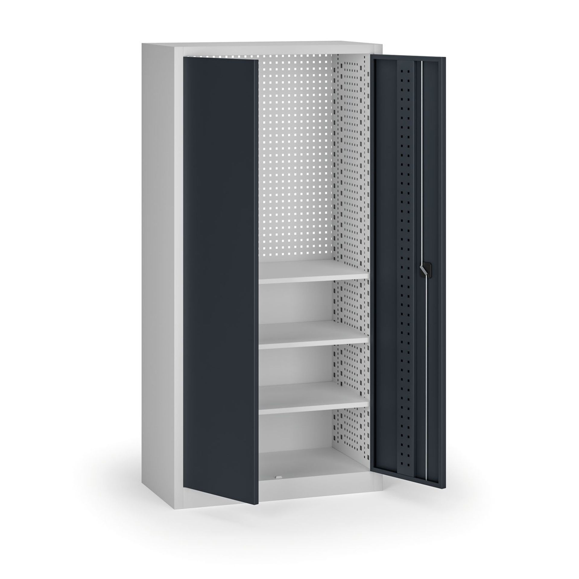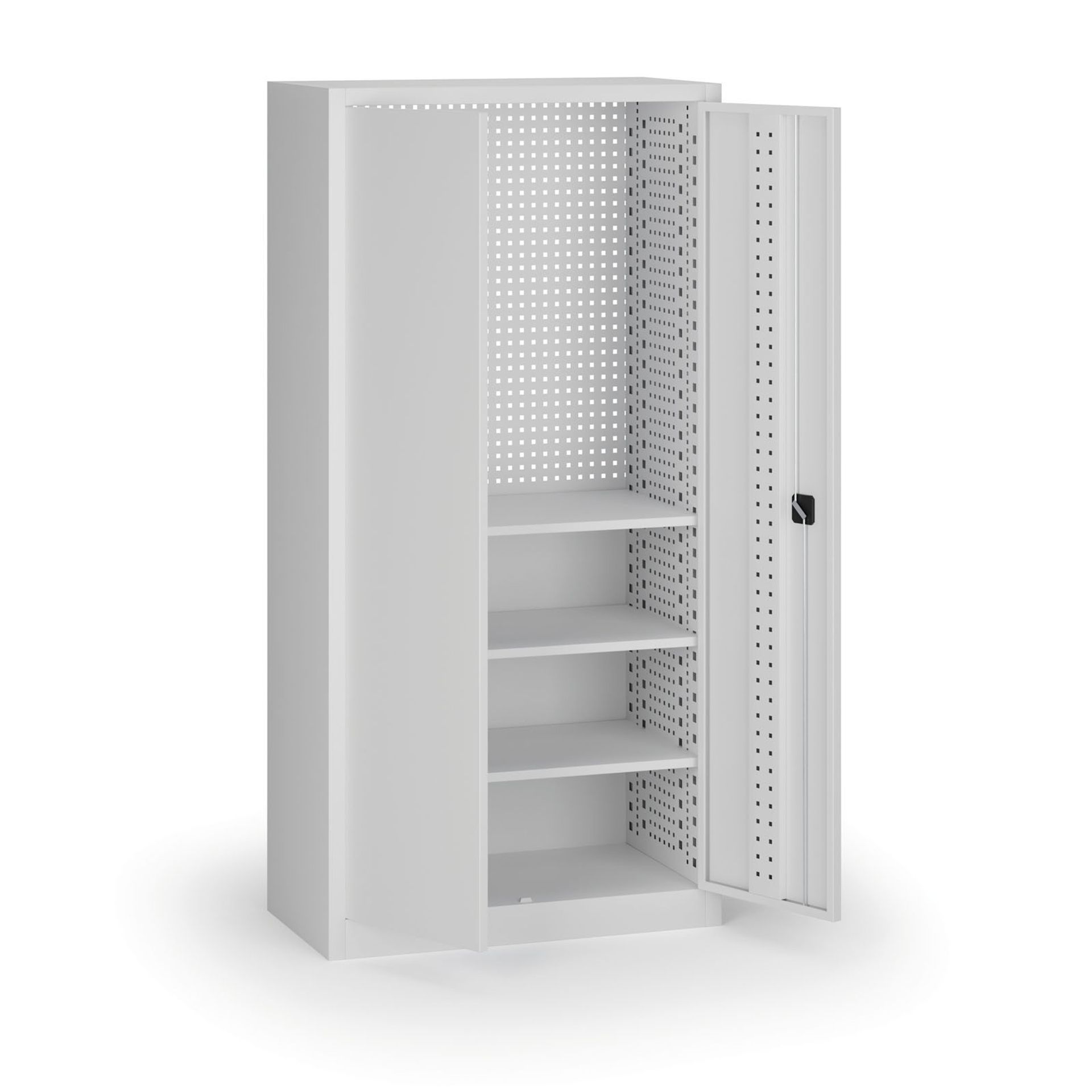 Dielenská skriňa so 3 policami, plná perforácia (dvere, boky aj zadná stena – EuroPerfo 10 × 10 mm, rozstup 38 × 38 mm), korpus RAL 7035, nosnosť 400 kg.