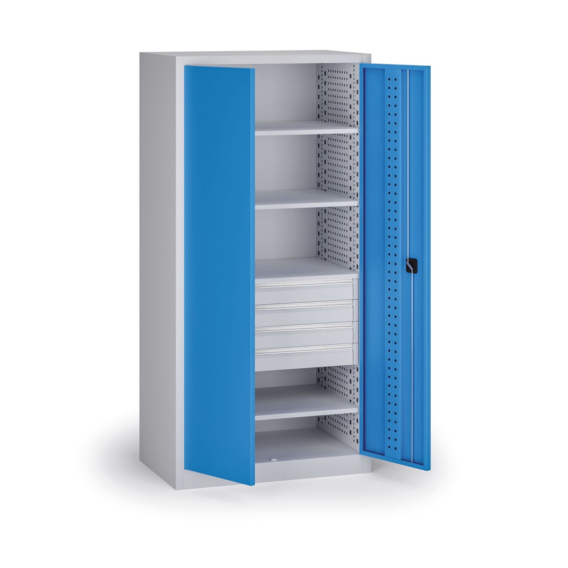 /Dielenský nábytok a vybavenie/Dielenské skrine/Dielenské skrine so zásuvkami/Policová dielenská skriňa na náradie KOVOS, 4 police, 4 zásuvky, perforovaná, 950 x 600 x 1950 mm, grafit