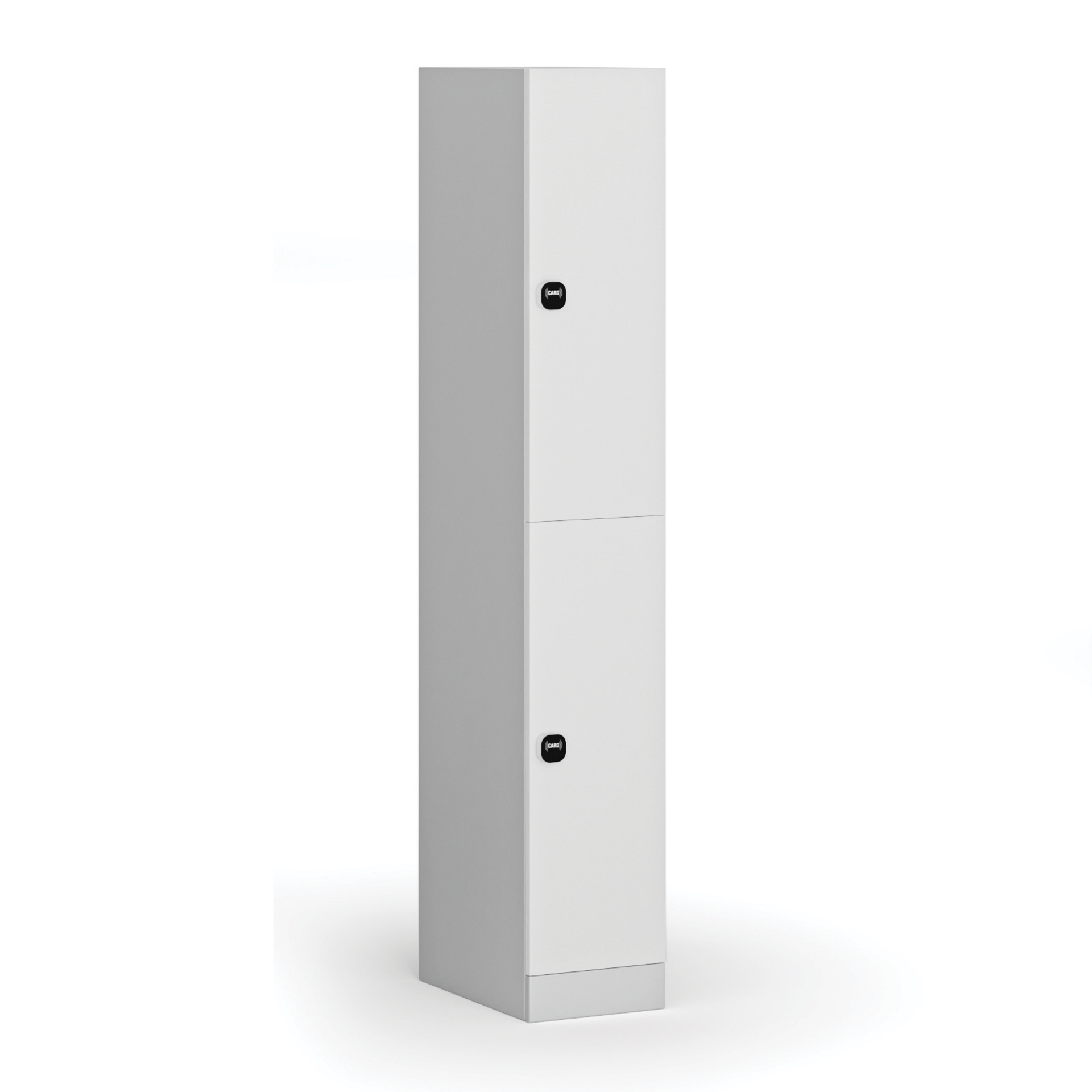 Skrinku so šírkou 300 mm tvorí 2 uzamykateľné boxy. Každý box poskytuje dostatok miesta na uloženie osobných vecí, batohov či tašiek. Toto úsporné a pritom bezpečné, uzamykateľné riešenie je ideálne všade tam, kde je potrebné šetriť miestom a zároveň nie je nutné zavesovať dlhšie odevy.