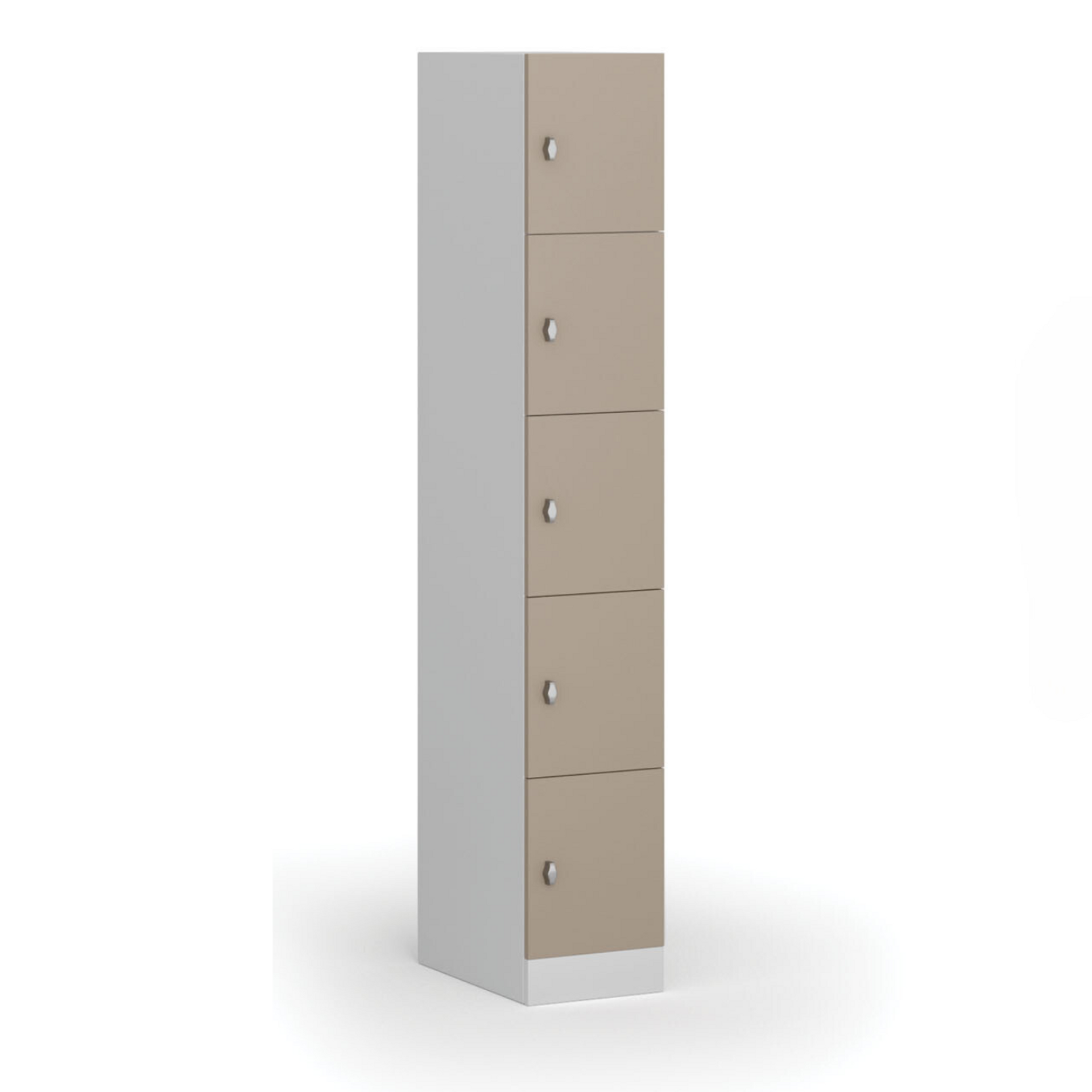 Skrinku so šírkou 300 mm tvorí 5 uzamykateľných boxov. Každý box poskytuje dostatok miesta na uloženie osobných vecí, batohov či tašiek. Toto úsporné a pritom bezpečné, uzamykateľné riešenie je ideálne všade tam, kde je potrebné šetriť miestom a zároveň nie je nutné zavesovať dlhšie odevy.