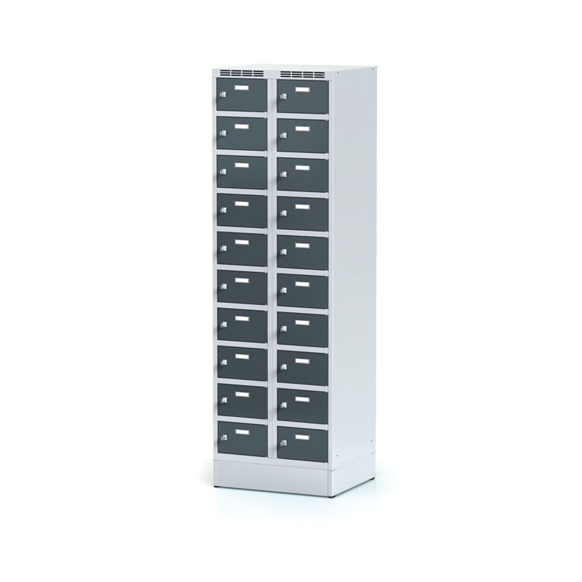 Skrinka so šírkou 300 mm tvorí 20 uzamykateľných boxov. Každý box poskytuje dostatok miesta na uloženie osobných vecí, batohov či tašiek. Toto úsporné a pritom bezpečné, uzamykateľné riešenie je ideálne všade tam, kde je potrebné šetriť miestom a zároveň nie je nutné zavesovať dlhšie odevy.
