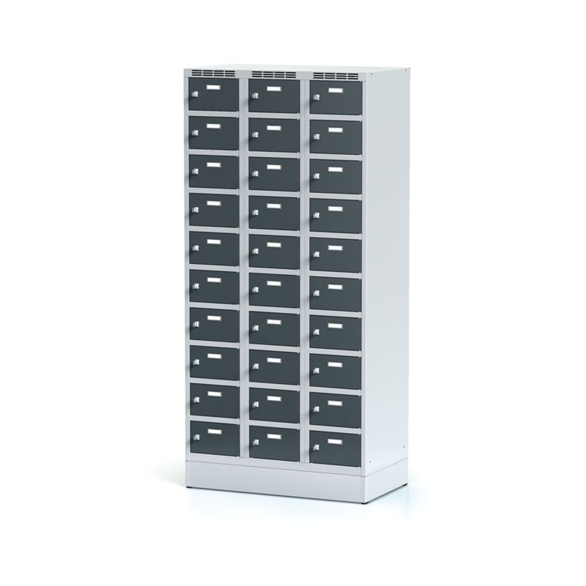Skrinka so šírkou 300 mm tvorí 30 uzamykateľných boxov. Každý box poskytuje dostatok miesta na uloženie osobných vecí, batohov či tašiek. Toto úsporné a pritom bezpečné, uzamykateľné riešenie je ideálne všade tam, kde je potrebné šetriť miestom a zároveň nie je nutné zavesovať dlhšie odevy.