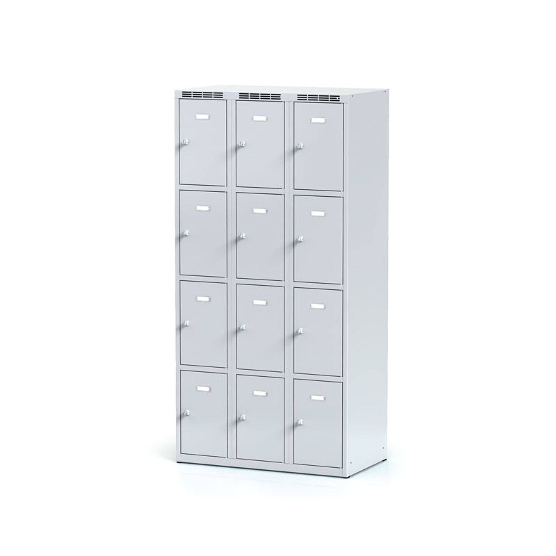 Skrinka so šírkou 300 mm tvorí 12 uzamykateľných boxov. Každý box poskytuje dostatok miesta na uloženie osobných vecí, batohov či tašiek. Toto úsporné a pritom bezpečné, uzamykateľné riešenie je ideálne všade tam, kde je potrebné šetriť miestom a zároveň nie je nutné zavesovať dlhšie odevy.