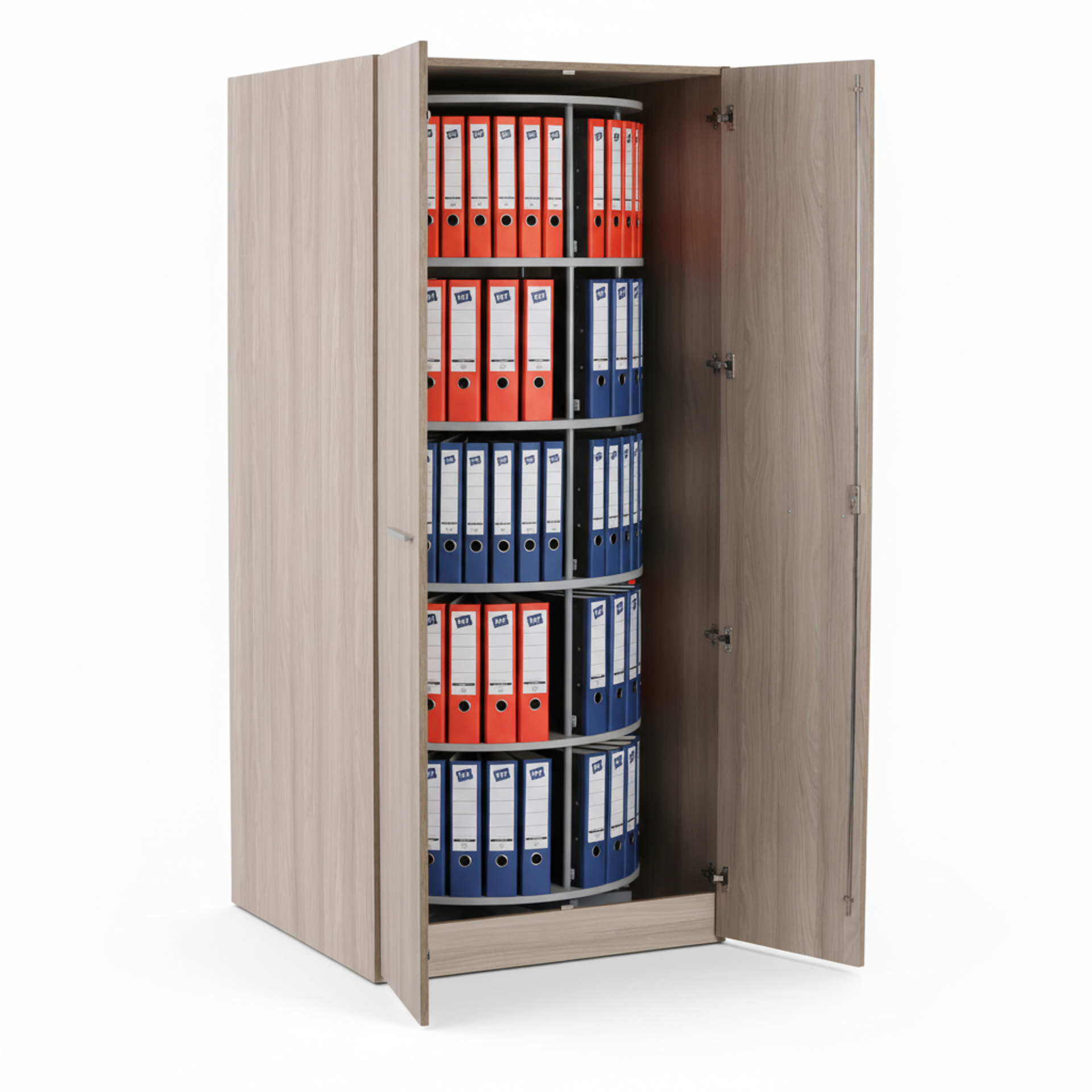 Táto uzamykateľná archivačná skriňa s otočným regálom na šanóny je ideálnym riešením pre firmy, archívy aj úrady, kde je potrebné bezpečne a prehľadne uložiť veľké množstvo dokumentov. Otočný systém šetrí miesto a umožňuje mať všetky šanóny vždy na dosah ruky, zatiaľ čo drevená skriňa poskytuje elegantný vzhľad a chráni obsah pred prachom aj neoprávneným prístupom.