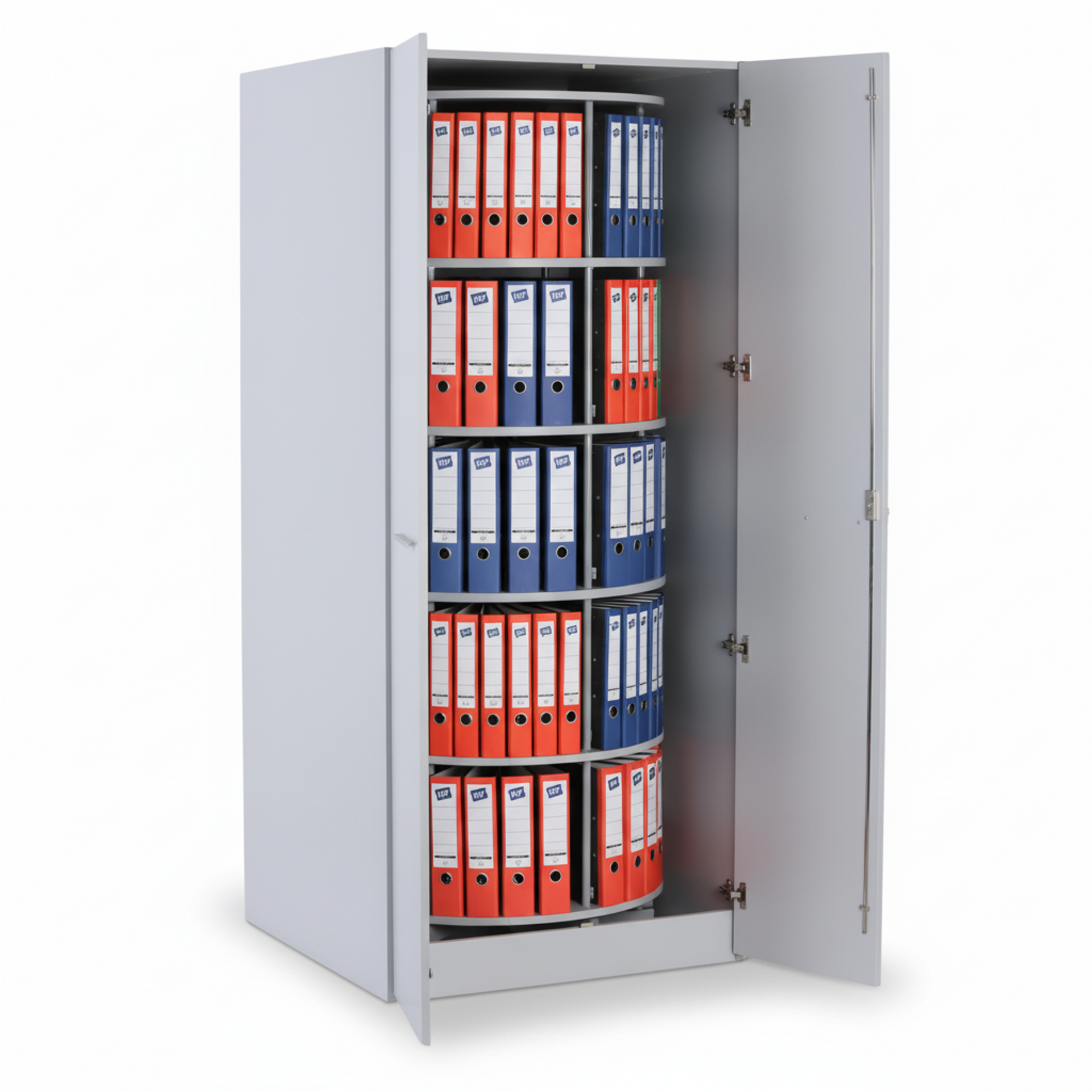 Uzamykateľná archivačná skriňa s otočným regálom na šanóny. Ideálna pre firmy, archívy aj úrady – kapacita až 120 zakladačov.