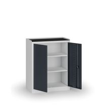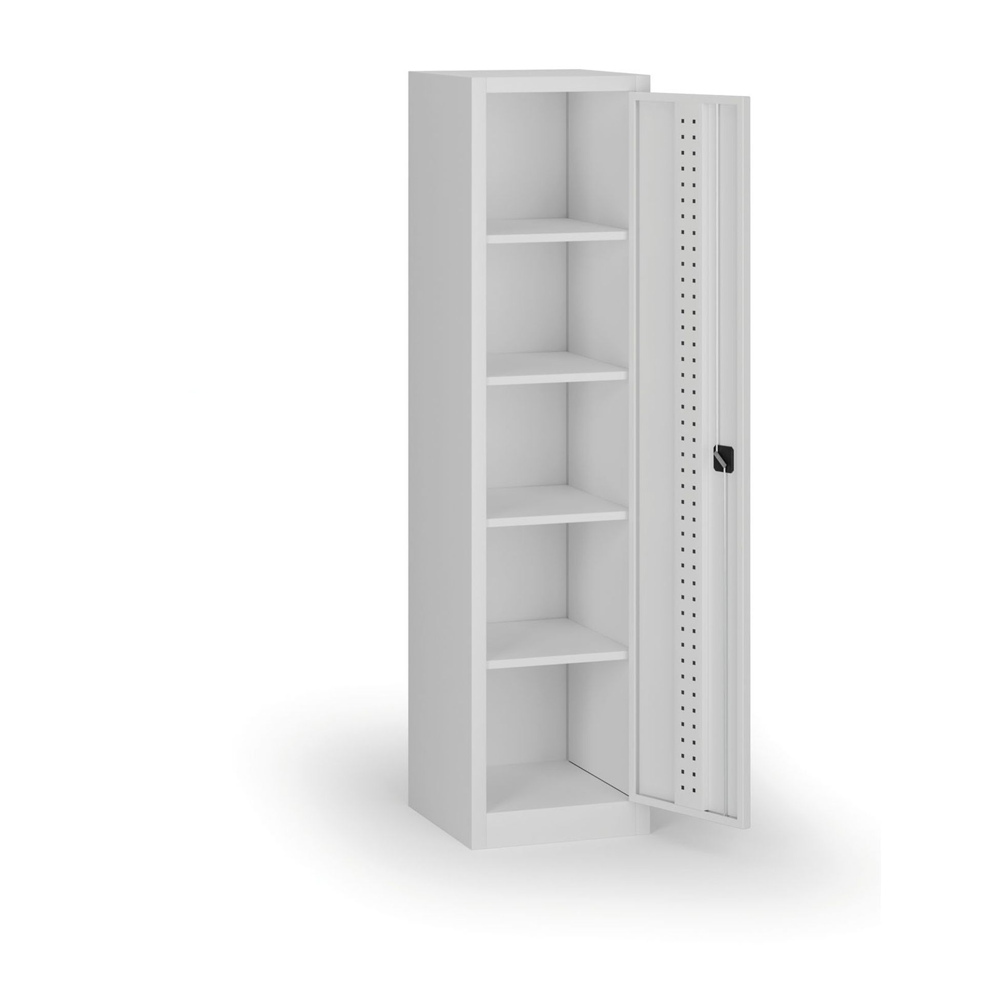 Úzka skriňa so 4 policami, perforácia vnútornej strany dverí (EuroPerfo 10 × 10 mm, rozstup 38 × 38 mm), korpus RAL 7035, nosnosť 400 kg.