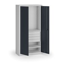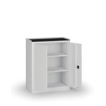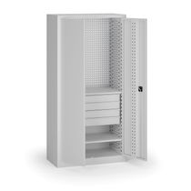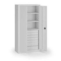 Kompaktná úzka dielenská skriňa so štyrmi nastaviteľnými policami pre efektívne využitie priestoru v dielňach a servisoch. Dvere sú perforované v systéme EuroPerfo (10 × 10 mm, rozstup 38 × 38 mm), boky aj zadná stena sú hladké. Konštrukcia z oceľového plechu s hrúbkou 0,7 mm zaručuje vysokú pevnosť a dlhú životnosť.