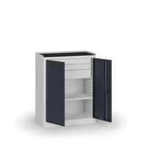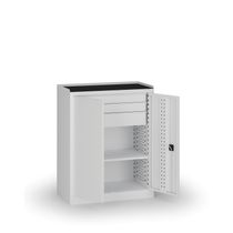 Kompaktná úzka dielenská skriňa so štyrmi nastaviteľnými policami pre efektívne využitie priestoru v dielňach a servisoch. Dvere sú perforované v systéme EuroPerfo (10 × 10 mm, rozstup 38 × 38 mm), boky aj zadná stena sú hladké. Konštrukcia z oceľového plechu s hrúbkou 0,7 mm zaručuje vysokú pevnosť a dlhú životnosť.